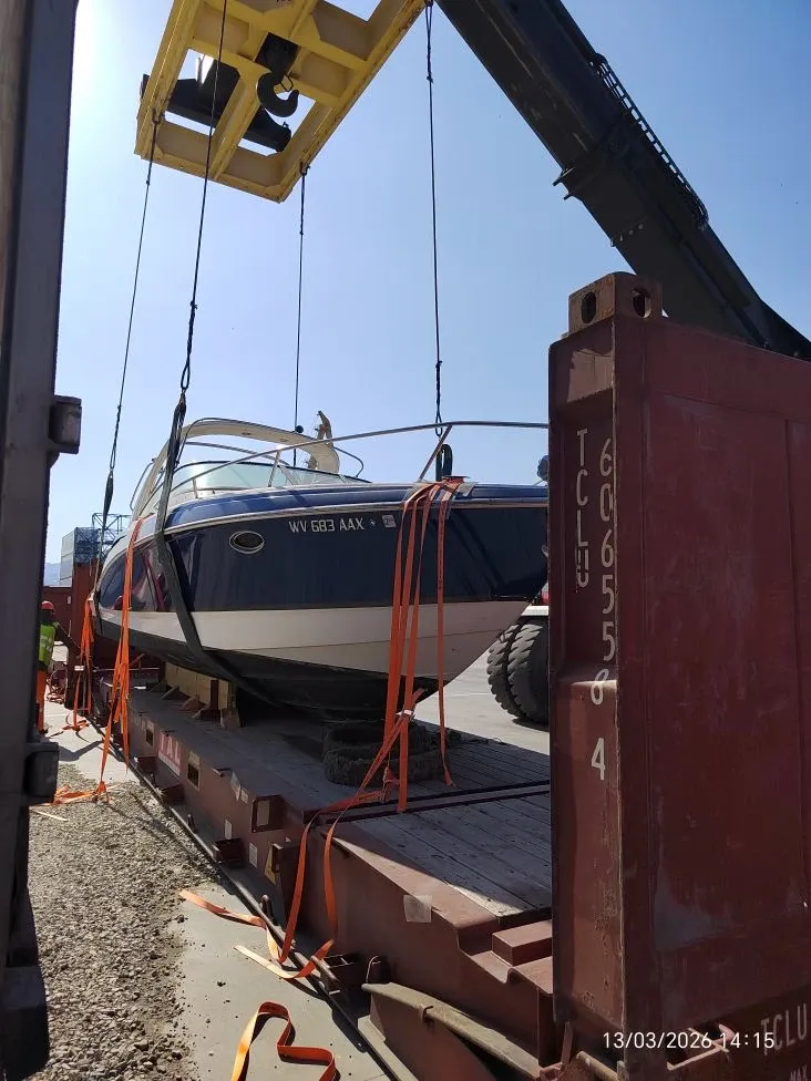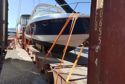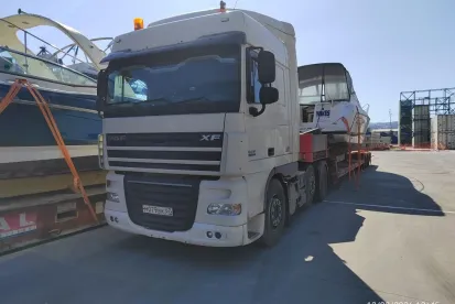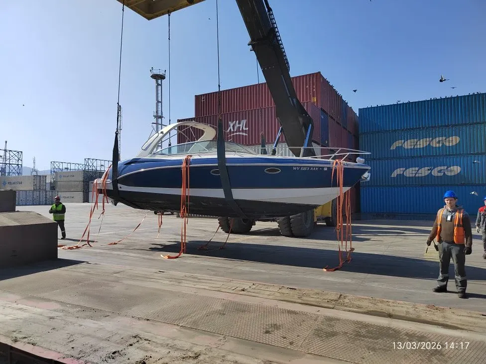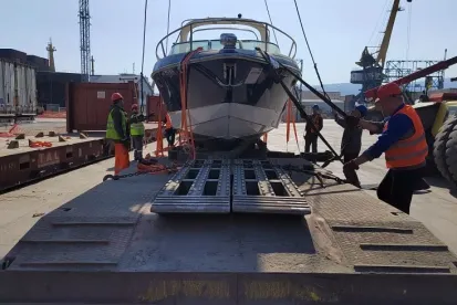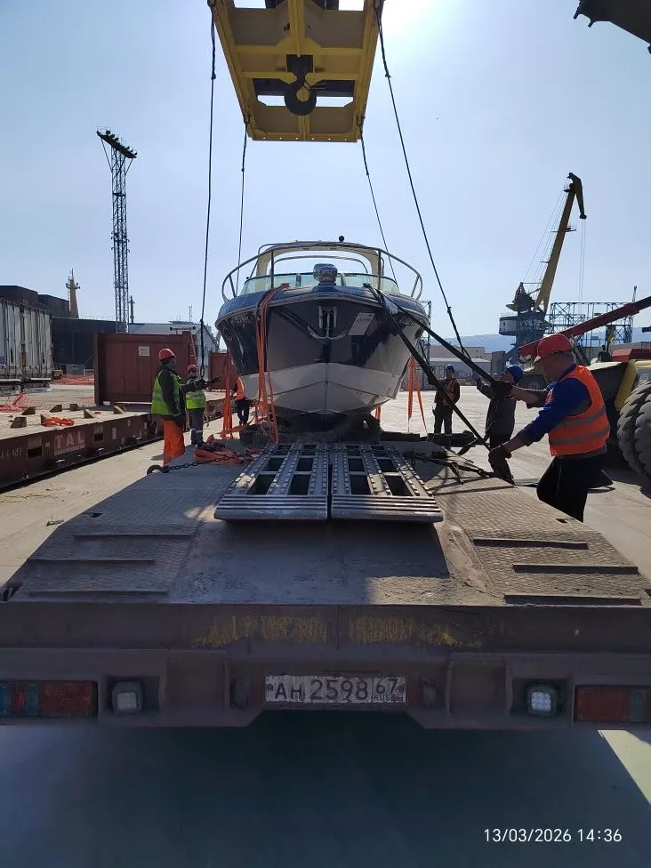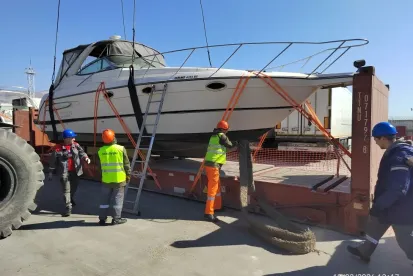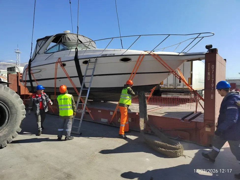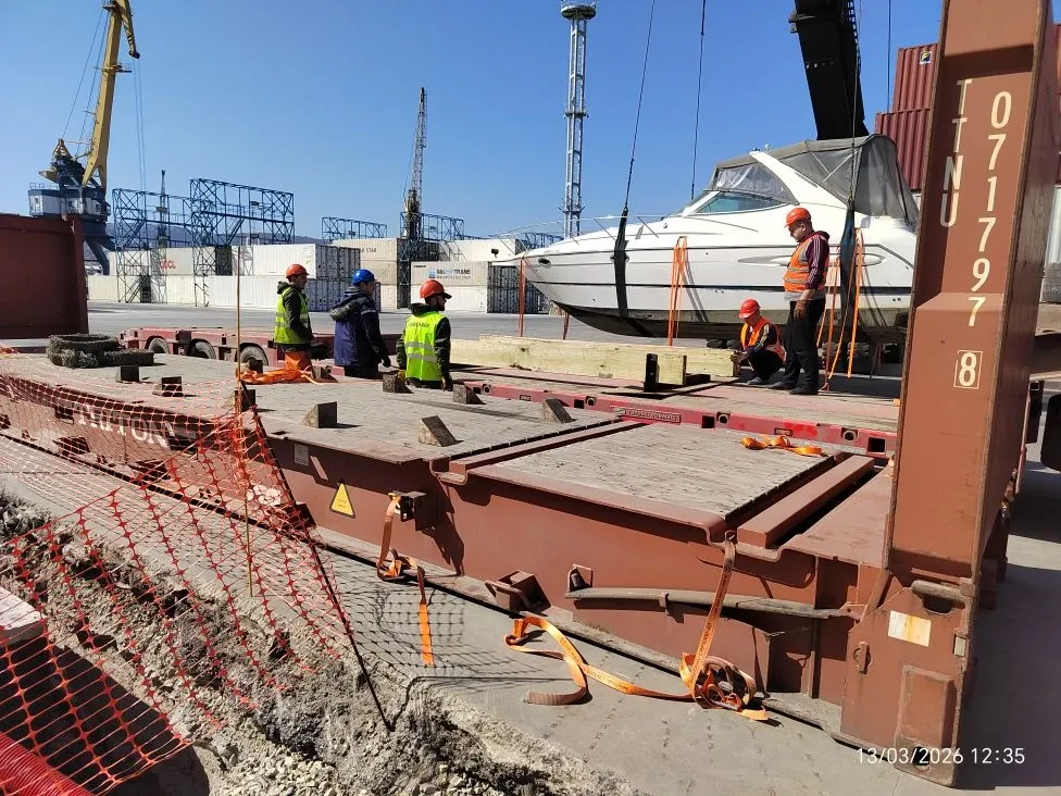 To organize the safe reloading of a boat from a flat-rack container onto a truck platform, preserving the hull and eliminating tilting or damage. For such transport, it is particularly important to prepare the vessel in advance, remove protruding components, and ensure secure fastening throughout the entire movement.