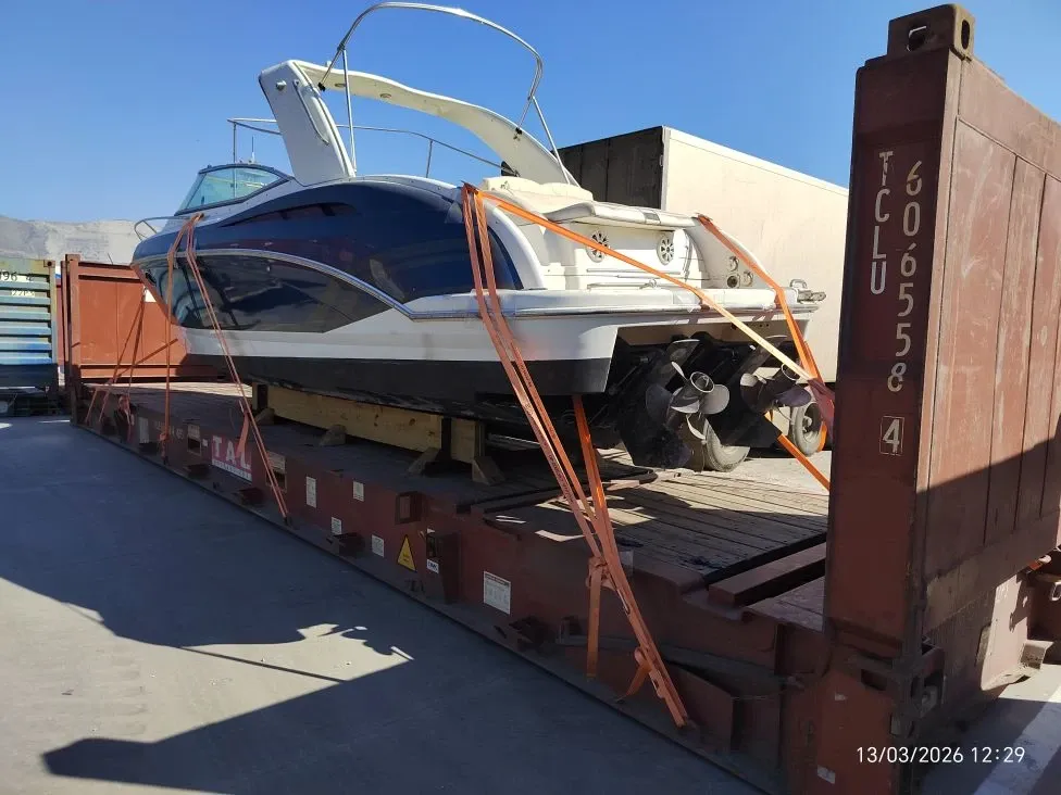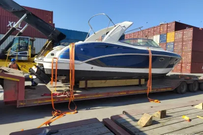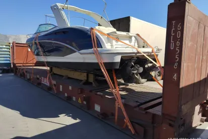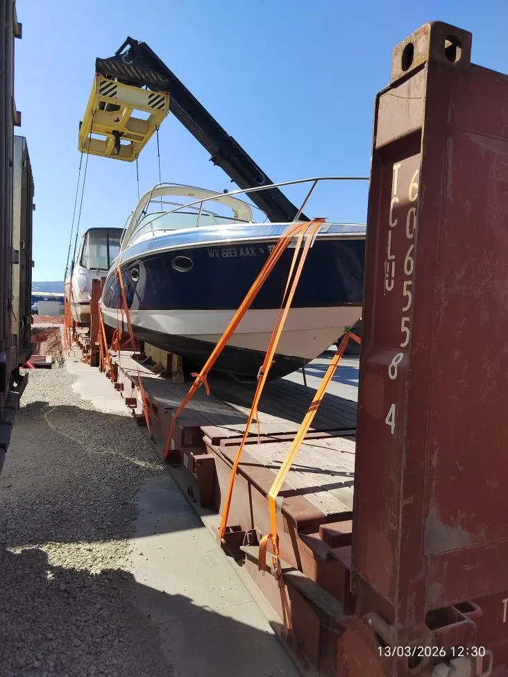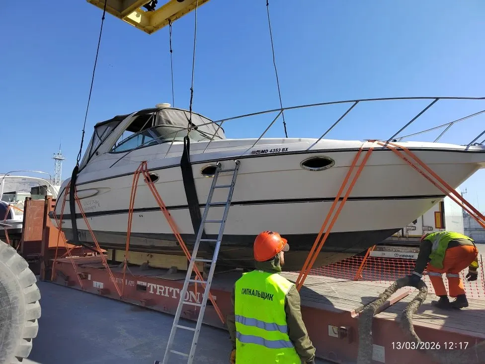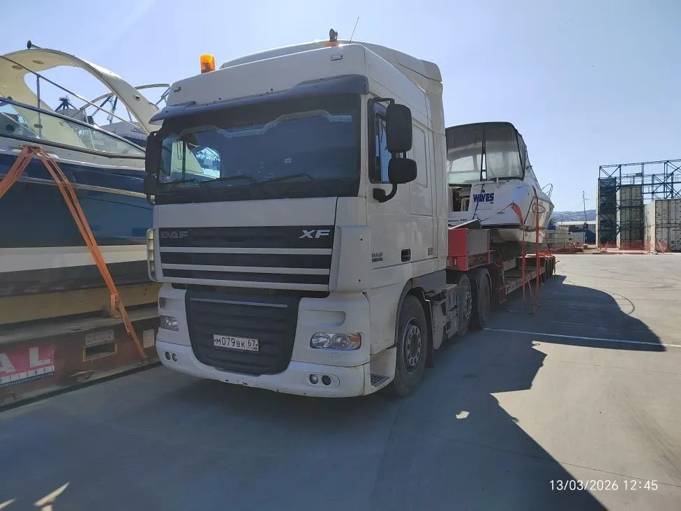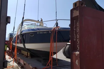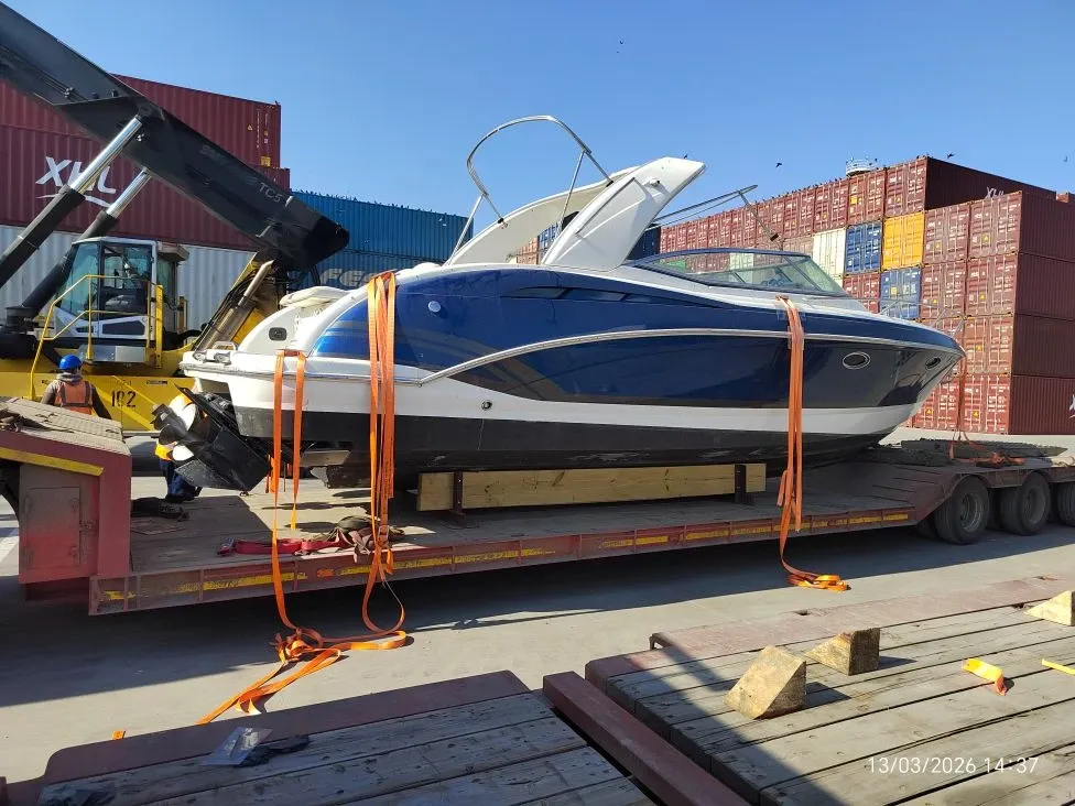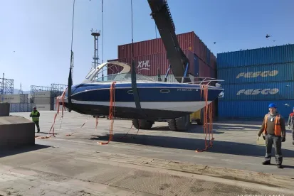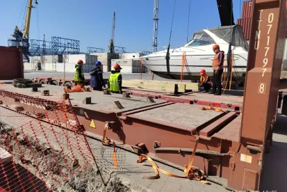To organize the safe reloading of a boat from a flat-rack container onto a truck platform, preserving the hull and eliminating tilting or damage. For such transport, it is particularly important to prepare the vessel in advance, remove protruding components, and ensure secure fastening throughout the entire movement.