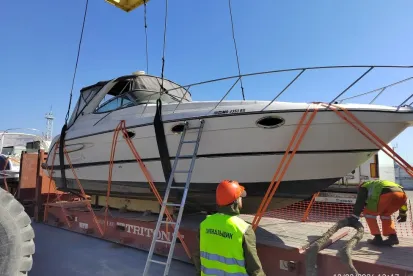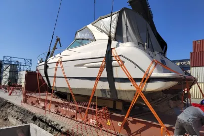 Preparation — Everything that could detach or interfere (antennas, rails if necessary) was removed from the boat. The propeller and rudder were protected. Soft supports (foam cushions) were prepared under the keel on the truck.