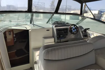 Slinging — Two wide textile slings were placed under the boat hull, strictly at points reinforced by the manufacturer (typically in the area of the keel and transom). Soft padding (mat, foam) was placed between the sling and the hull. The slings were connected to the crane's spreader bar.