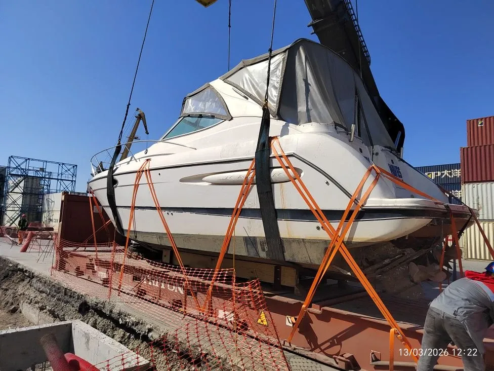 Unlashing — All straps and lashings securing the boat on the flat-rack container during sea transport were released.